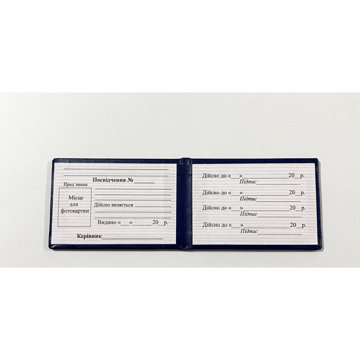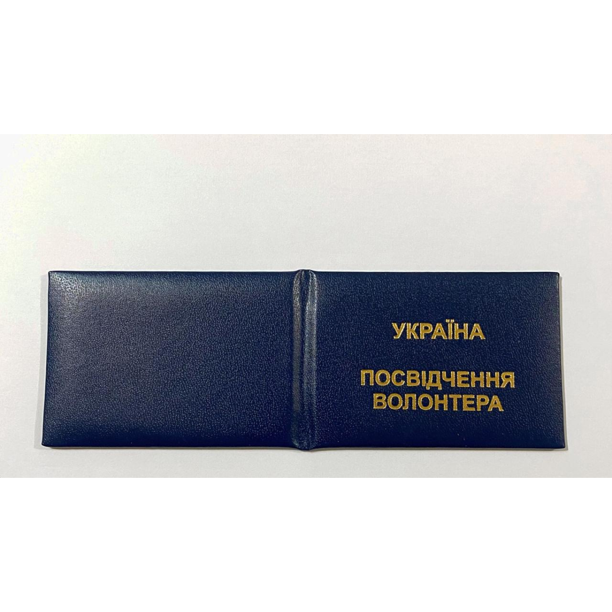 Посвідчення волонтера виготовлено з м'якого картону на поролоновій основі, обтягнутий бумвінілом темно-синього кольору. Всередині посвідчення між форзаців вклеєно вініловий середник, для меншого зносу документа при частому відкриванні.