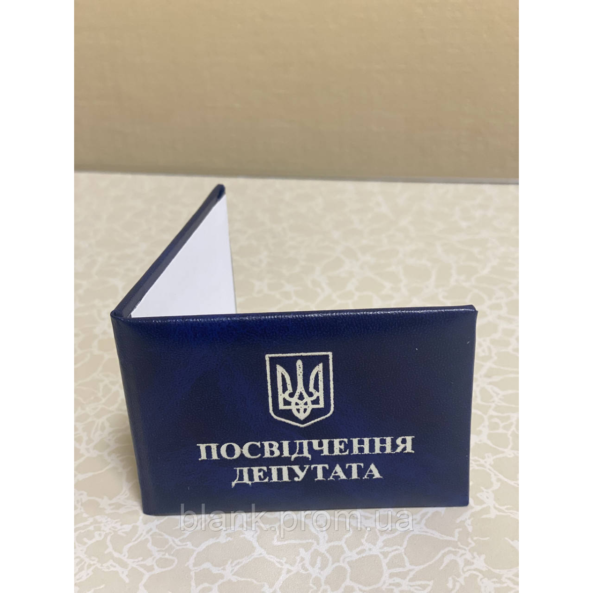 Бланк для посвідчення депутата пустий (для вклеювання власного шаблону посвідчення) виготовлено з пом`якшеного палітурного картону на поролоновій основі, обтягнутий бумвінілом темно-синього кольору. Всередині посвідчення вклеєно вініловий середник(перегородка) для меншого зносу документа при частому відкриванні. Тиснення сріблястою фольгою. Розмір у закритому вигляді: 90*65 мм