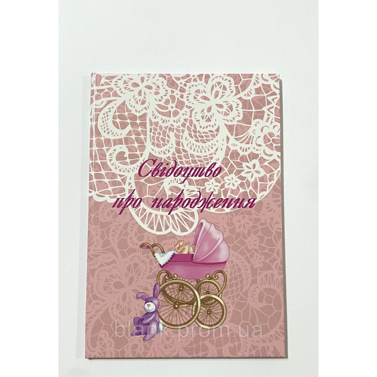 Обкладинка для свідоцтва про народження виготовлена з палітурного картону, обтягнута ламінованою обкладинкою, всередині обкладинки вклеєно два файлики для фіксації документа. Розмір у закритому вигляді: 195*130 мм