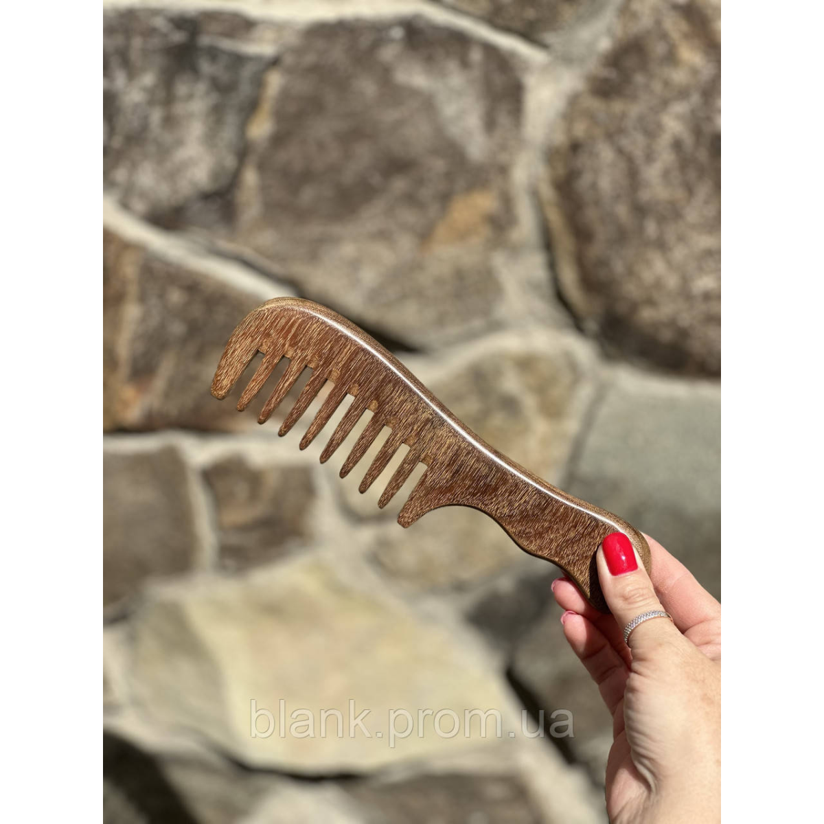 Гребінець із чорного сандалу-дерева південних країн, з підвищеною щільністю та міцністю матеріал. Зубчики чудово справляються з густим і неслухняним волоссям. Не електризує волосся. Форма зубчиків дає змогу розчісувати заплутане волосся без пошкоджень шкіри голови та неприємних відчуттів. Довжина: 18см Ширина: 5,5см Відстань між зубчиками: 0,6см