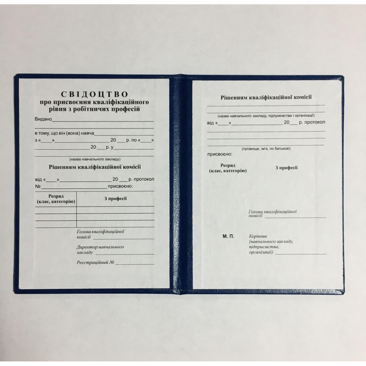 Бланк свідоцтво виготовлений з палітурного картону товщиною 2мм,обтягнутий синім бумвінілом. Всередині свідоцтва форзац з шаблоном для заповнення документа. Тиснення золотою фольгою. Розмір в закритому вигляді: 15,8*10,5, см