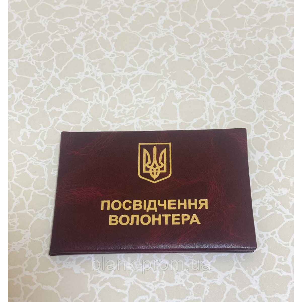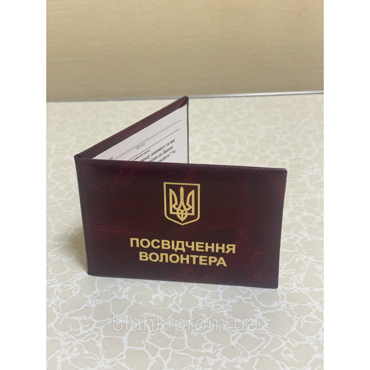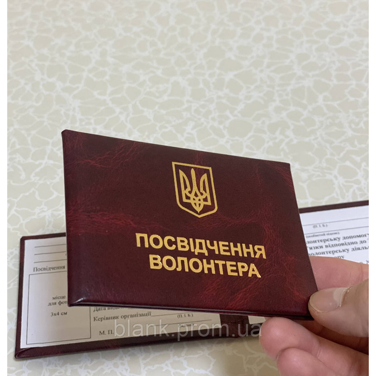 Посвідчення волонтера з гербом України виготовлено з палітурного картону, обтягнутий бумвінілом бордового кольору. Зразок посвідчення затверджено КабМіном України. Всередині посвідчення між форзаців вклеєно вініловий середник, для меншого зносу документа при частому відкриванні. Розмір посвідчення у закритому вигляді:100*70 мм Розмір фото: 3*4 см Тиснення золотою фольгою.