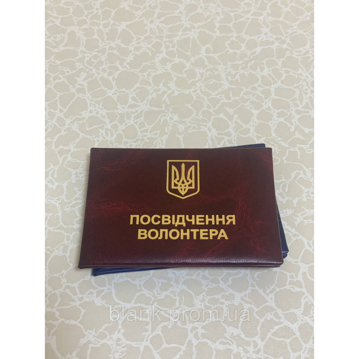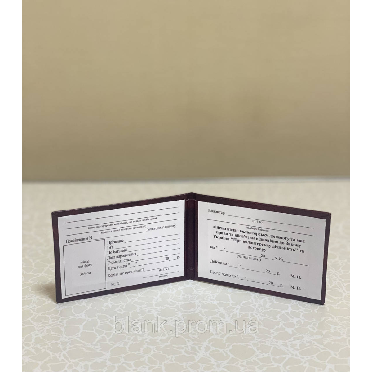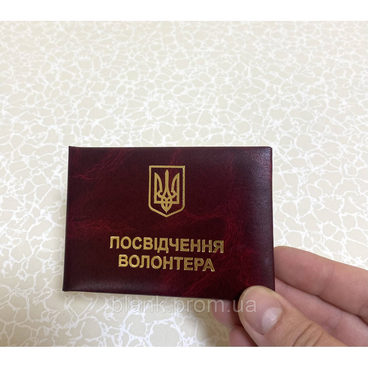 Посвідчення волонтера з гербом України виготовлено з палітурного картону, обтягнутий бумвінілом бордового кольору. Зразок посвідчення затверджено КабМіном України. Всередині посвідчення між форзаців вклеєно вініловий середник, для меншого зносу документа при частому відкриванні. Розмір посвідчення у закритому вигляді:100*70 мм Розмір фото: 3*4 см Тиснення золотою фольгою.