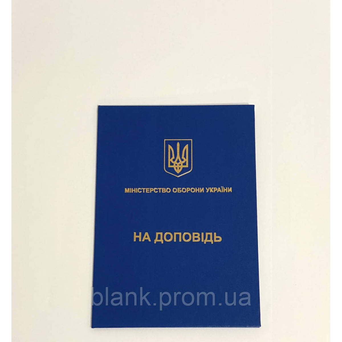 Папка на доповідь (Міністерство збройних сил України) розміру А4, виготовлена з твердого палітурного картону товщиною 2мм, обтягнута бумвінілом синього кольору. Всередині вклеєний ватман зі стрічкою для фіксації документа. Тиснення золотою фольгою Розмір в закритому вигляді: 30.5*21.7 см
