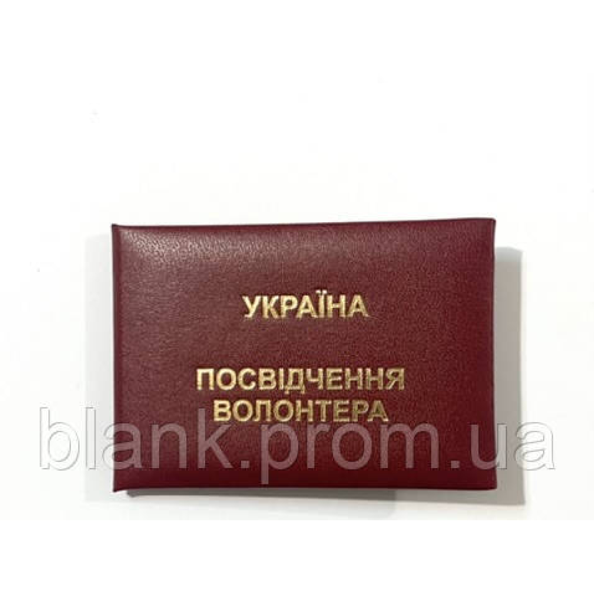 Посвідчення волонтера виготовлено з м“якого картону на поролоновій основі, обтягнутий бумвінілом бордового кольору. Зразок посвідчення затверджено КаБміном України. Всередині посвідчення між форзаців вклеєно вініловий середник, для меншого зносу документа при частому відкриванні. Розмір фото: 3*4 см Тиснення золотою фольгою. Розмір в закритому вигляді: 100*70 мм