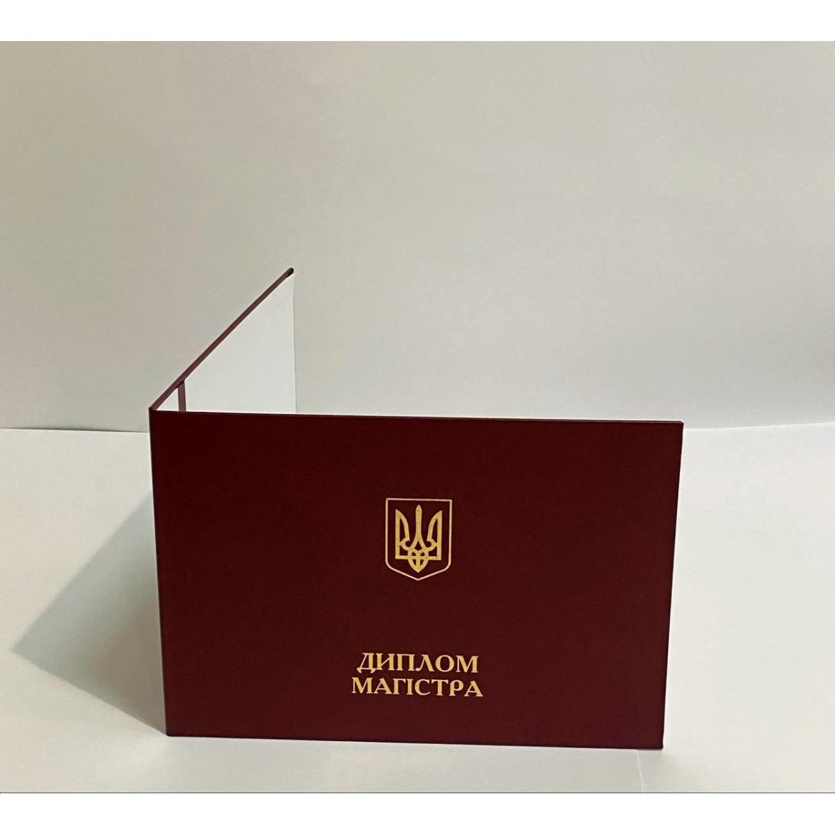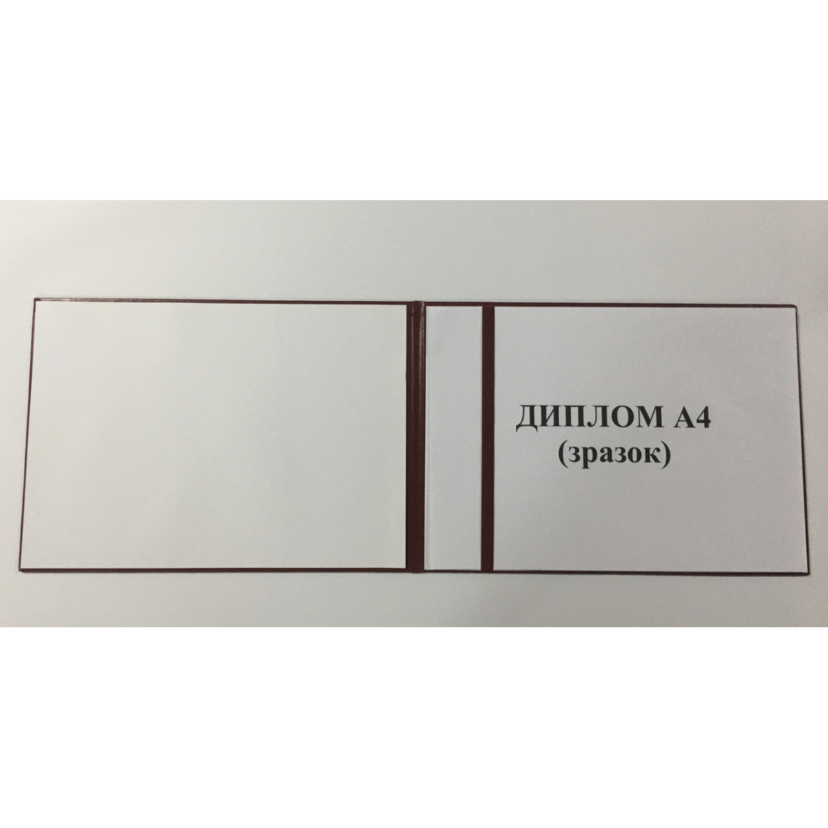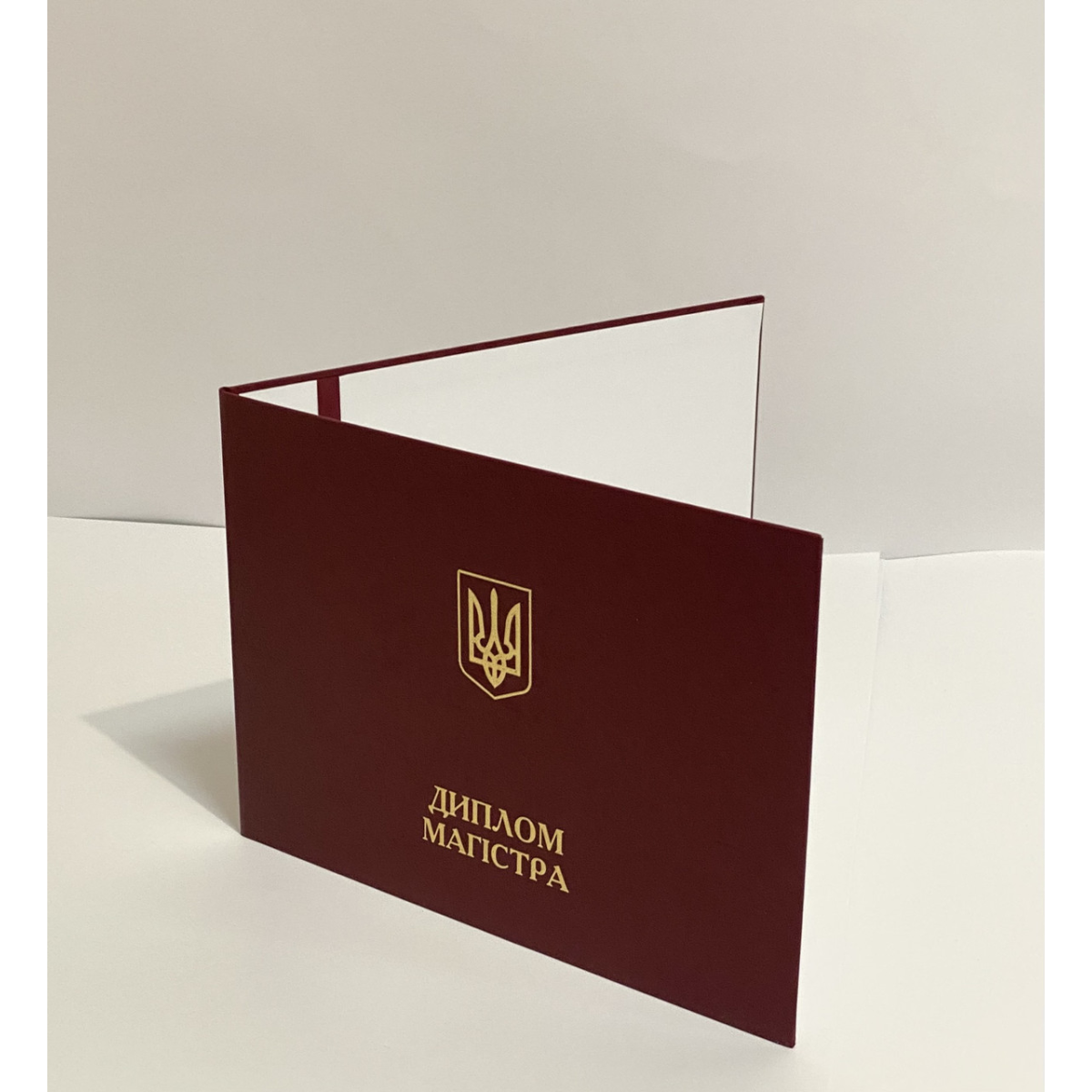 Обкладинка для диплома магістра А4, альбомна орієнтація, виготовлена з палітурного картону товщиною 2 мм і обтягнута бордовим бумвінілом, всередині обкладинки ватман зі стрічкою для фіксації документа.