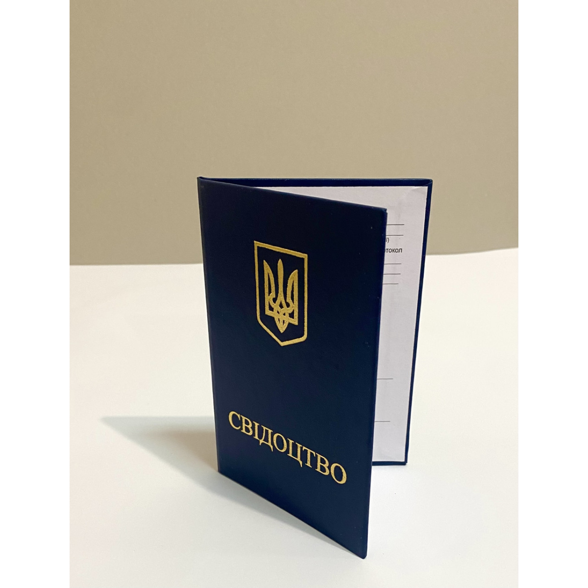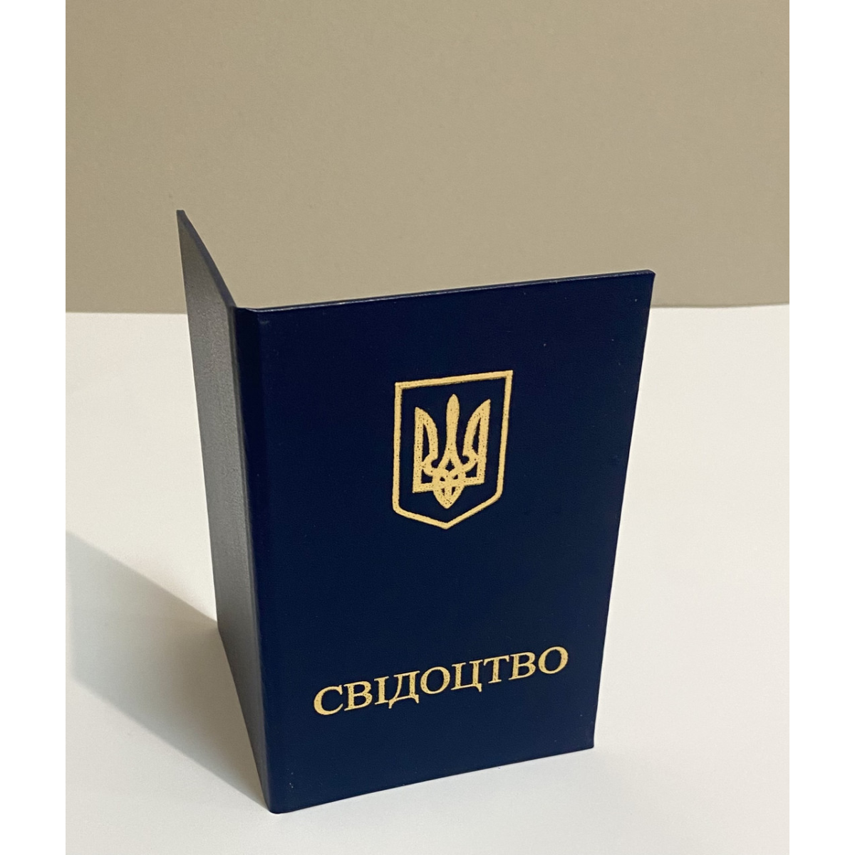 Бланк свідоцтво виготовлений з палітурного картону товщиною 2мм,обтягнутий темно-синім бумвінілом. Всередині свідоцтва форзац з шаблоном для заповнення документа. Тиснення золотою фольгою.