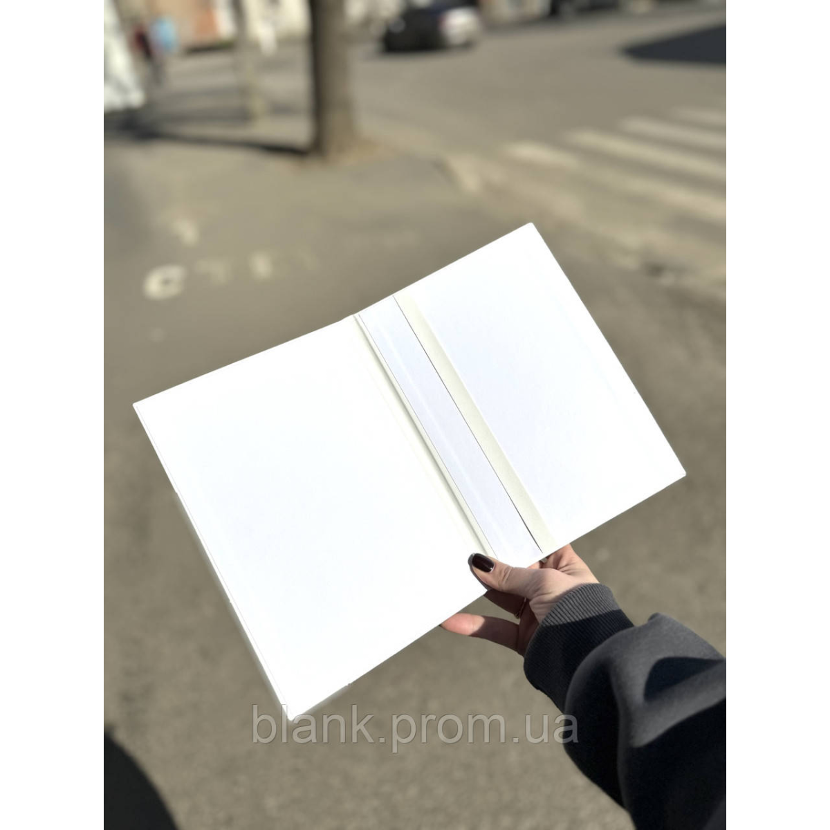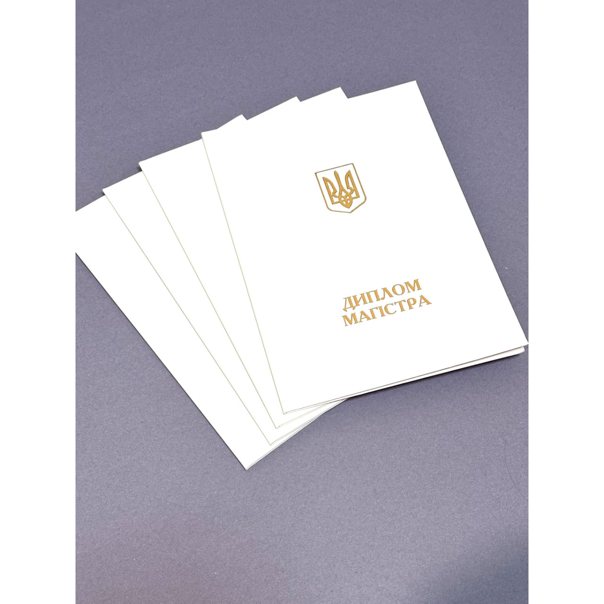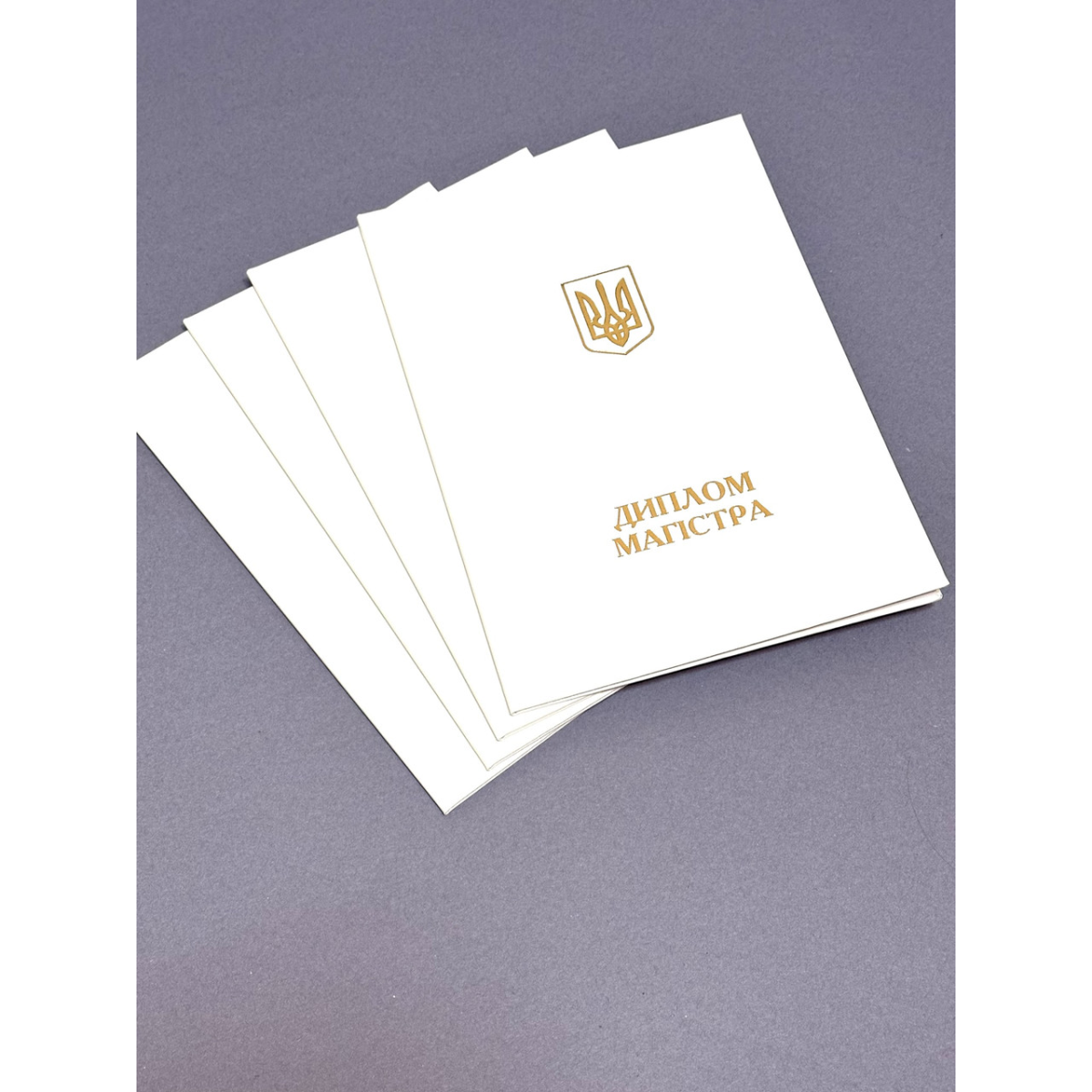 Обкладинка для диплома магісра А4, книжкова орієнтація, виготовлена з палітурного картону товщиною 2мм і обтягнута білим бумвінілом, всередині обкладинки вклеєно ватман зі стрічкою для фіксації документа. Тиснення золотою фольгою. Розмір у закритому вигляді: 217*305мм