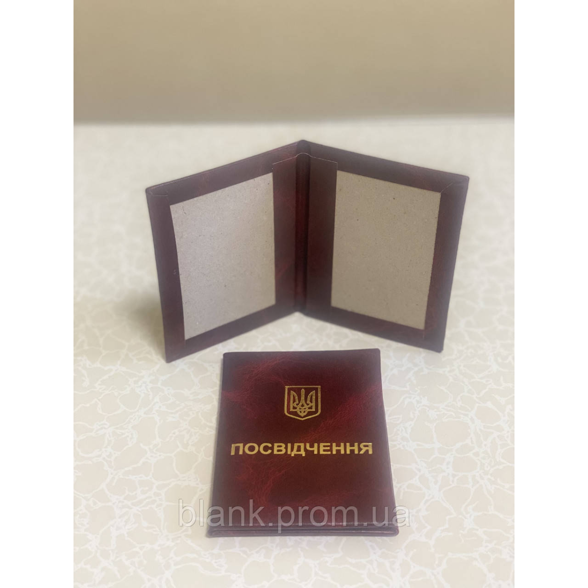 Бланк для будь-якого посвідчення книжкової орієнтації (для вклейки власного шаблону) виготовлено з м“якого картону з поролоном, обтягнутий бумвінілом бордового кольору. Всередині посвідчення вклеєно вініловий середник, для меншого зносу документа при частому відкриванні. Тиснення золотою фольгою. Розмір в закритому вигляді: 100*75 мм